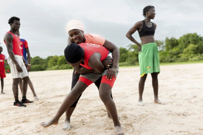 Around Sambou’s village, there are no gyms where girls can do strength training. They don’t have the special shoes used in Olympic wrestling, and instead train barefoot. They don’t have mats, so they make do with sandy grounds.