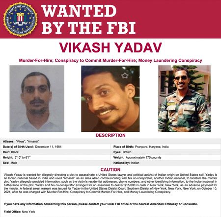 PRANPURA, India (Reuters) – An Indian ex-official charged by the U.S. with directing a murder-for-hire plot has dismissed the allegations, his family said, expressing shock that Vikash Yadav was wanted by the FBI.