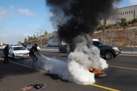 JERUSALEM (Reuters) – Protests aimed at pressuring the Israeli government to reach a hostage deal with Hamas began across the country on Sunday, with demonstrators blocking roads and picketing at the homes of government ministers.