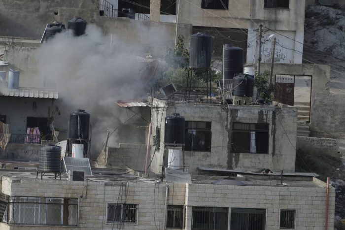 The AP reporter who witnessed the raid saw a blindfolded and shirtless Palestinian man kneeling before an Israeli army jeep and armed soldiers. Smoke billowed from several buildings that appeared damaged.