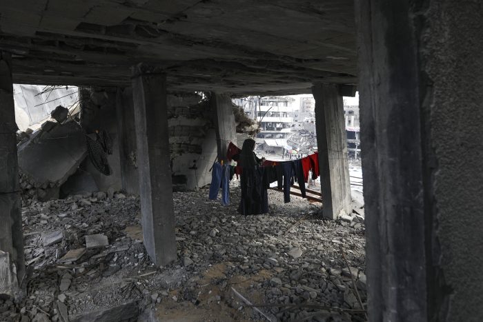 Hani Al-Shanti, displaced from Gaza City, looked forward to feeling at peace in whatever he found, “even if it is a roof and walls without furniture, even if it is without a roof.” One newly returned woman hung laundry in the ruins of her home, its walls blown out.