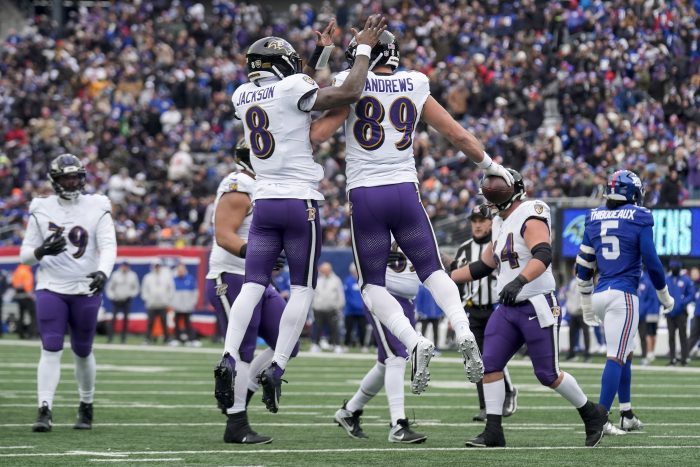 Andrews’ TD catch late in the first quarter gave the tight end a franchise-record 48 career touchdowns, breaking a tie with running back Jamal Lewis.