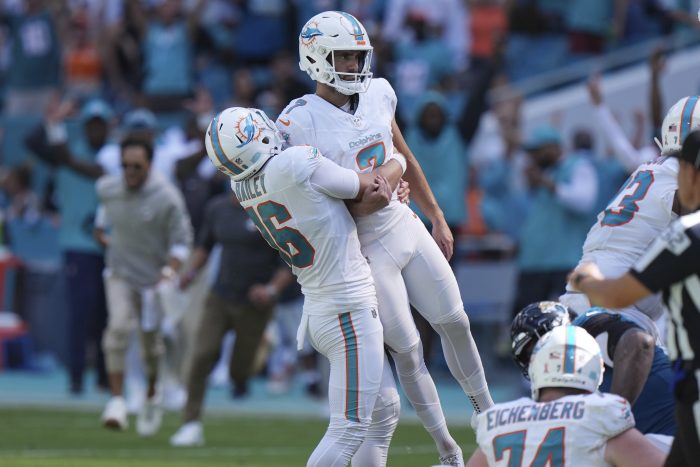 MIAMI GARDENS, Fla. (AP) — For the Miami Dolphins, the day started with chaos and ended with celebration. Jason Sanders nailed a 52-yard field goal as time expired, and the Dolphins — on probably one of the more bizarre days in their history, one where two players were placed in handcuffs outside the stadium a […]