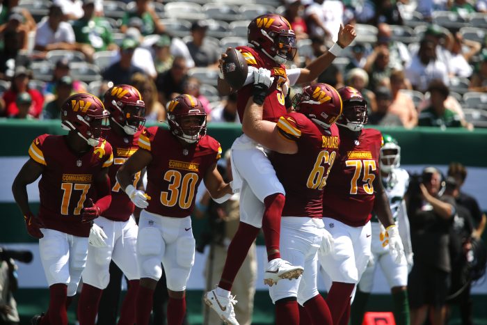 The former LSU star and most of the Commanders’ starters on offense played just the opening series against Jets backups — and the young QB kept it going on his second pass when he connected with Dyami Brown for 42 yards along the right sideline on third-and-6 from Washington’s 34.