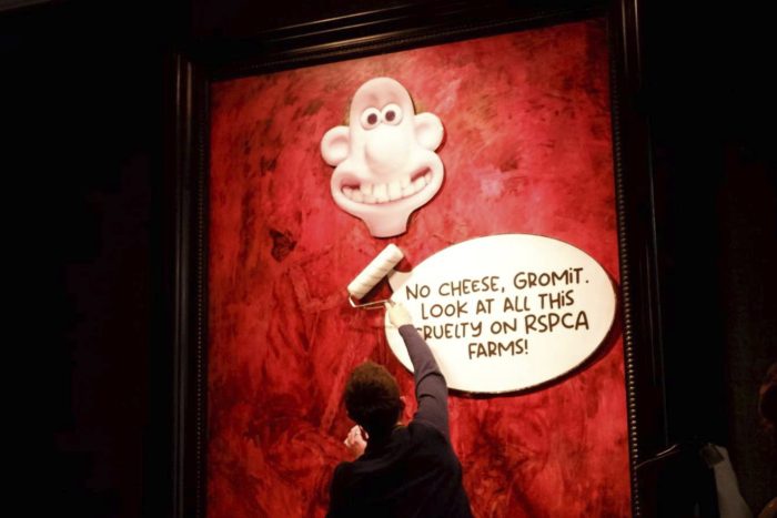 A speech bubble next to the head of Wallace read: “No cheese, Gromit. Look at all this cruelty on RSPCA farms!”