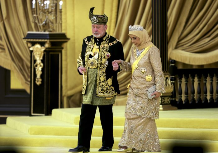 Donned in black and gold traditional ceremonial outfit and headgear, Sultan Ibrahim and Queen Raja Zarith Sofiah were greeted by military salute before they proceeded to the throne. The heads of the other royal families, Brunei Sultan Hassanal Bolkiah and Bahrain King Hamad Isa al Khalifa were seated on a stage beside the throne.