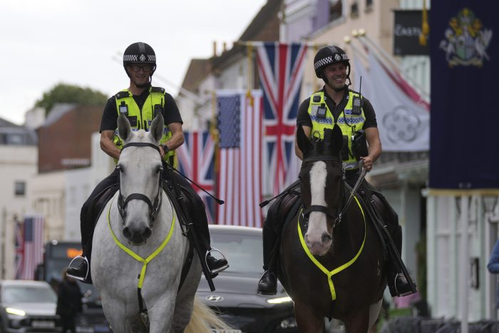 Police in bright yellow vests were seen around the historic town west of London, where the main street was lined with U.K. and U.S. flags.