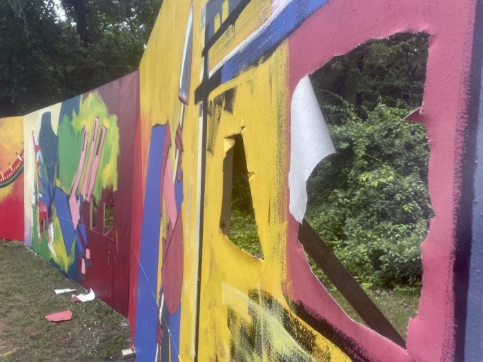 An artist who helped create the memorial arrived Saturday morning to find gaping holes in the painted canvas backdrop he had recently installed. Roberto Marquez told The Baltimore Sun he reported the vandalism to police.