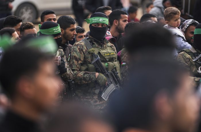 DEIR AL-BALAH, Gaza Strip — Dozens of masked and armed Hamas fighters, some driving white pickup trucks with guns mounted on them, lined up Saturday morning at the location of the exchange near the territory’s main north-south highway in Central Gaza.