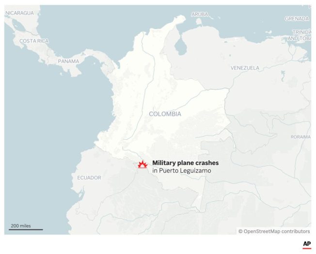 BOGOTA, Colombia (AP) — A military transport plane with 128 people on board, mostly soldiers, crashed shortly after taking off Monday in Puerto Leguizamo, Colombia, killing at least 66 people and leaving dozens injured, the head of Colombia’s armed forces said.