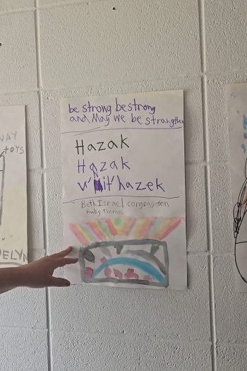 Thomas was excited to see that one of the pictures was made by her daughter, Ruby. Underneath the words to a Hebrew song that Myers taught the children about strength, Ruby drew bright blue water overcoming red flames, producing a triumphant rainbow.