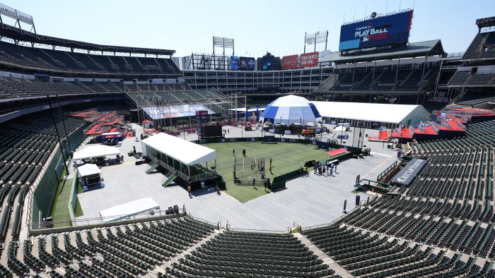 MLB is utilizing the old ballpark this week as part of the All-Star Village, including a wiffle ball field situated near where the infield once was and by a nearby domed tent shading the world’s largest baseball. Jerseys and other memorabilia from former Rangers players are on display in their old clubhouse.