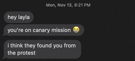 She said she did not realize at the time that a chant Canary Mission took issue with, “When people are occupied, resistance is justified,” is considered by some as an expression of support for Hamas’ killings. She joined in the chants, she said, to show support for demonstrations.