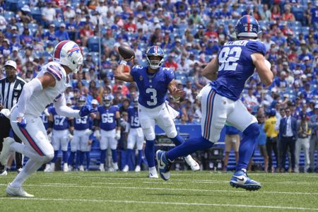 Free agent signee Russell Wilson completed 6 of 7 passes for 28 yards on the Giants’ opening drive that ended in a 53-yard field goal, and rookie first-rounder Jaxson Dart followed with a 12-for-19 performance that included 154 yards and a touchdown as the New York’ Giants recorded a 34-25 win over the Buffalo Bills on Saturday at Orchard Park, N.Y.