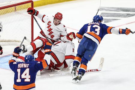 Mathew Barzal scored 1:24 into the second overtime Saturday for the host New York Islanders, who avoided elimination in their Eastern Conference first-round series with the Carolina Hurricanes with a 3-2 win in Game 4 in Elmont, N.Y.