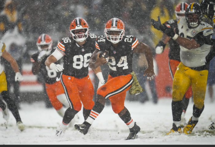 With snow piling up and covering the yard lines on the field, Cleveland’s Jameis Winston c ompleted a third-down pass to Jerry Jeudy to the Pittsburgh 9. Two plays later, Chubb barreled into the end zone.