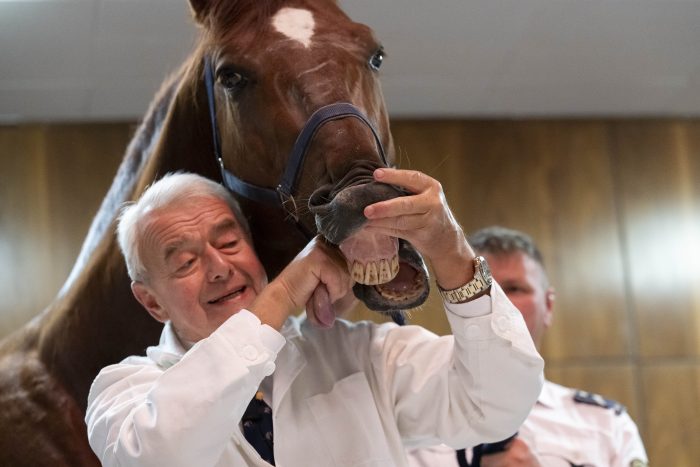 About halfway through the hourlong lesson, Sótonyi demonstrated the oral structure of one of the animals, reaching his hand inside its mouth to grasp its long tongue — and getting a gentle nip from the horse in return.