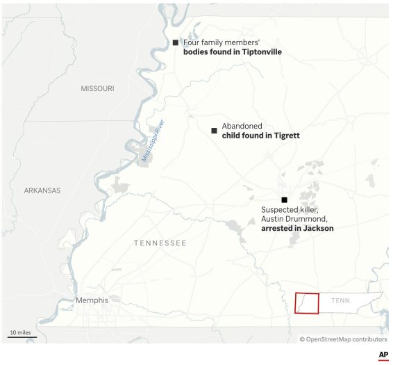 Officers had responded to a call of an infant in a car seat being dropped at a “random individual’s front yard” in the Tigrett area, roughly 40 miles (65 kilometers) from Tiptonville, the Dyer County Sheriff’s Office said.