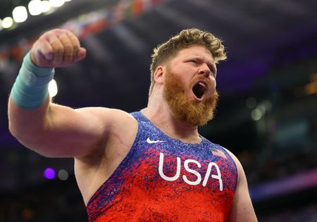 PARIS (Reuters) -American Ryan Crouser became the first man to “three-peat” in the Olympic shot put on Saturday, adding another gold medal to his packed trophy cabinet with a mighty throw of 22.90 metres.