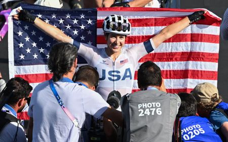 PARIS (Reuters) -American Kristen Faulkner caused a major upset as she won the women’s road race gold medal at the Paris Olympics on Sunday, making the most of the top guns’ mind games to snatch the biggest victory of her career.