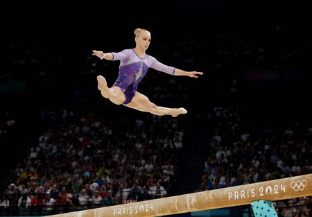 PARIS (Reuters) -Italian gymnast Alice D’Amato emerged as the surprise champion on the balance beam at the Paris Olympics on Monday after American favourite Simone Biles unexpectedly fell off the 10cm wide apparatus during the final to finish out of the medals.