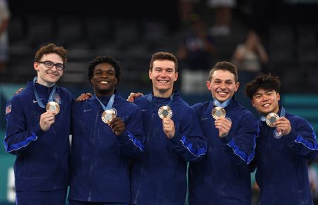 PARIS (Reuters) – The U.S. men’s gymnastics squad made a huge statement in Paris on Monday as they put together a stunning third-place performance to end their 16-year Olympic medal drought, announcing themselves as a force in the gymnastics world.