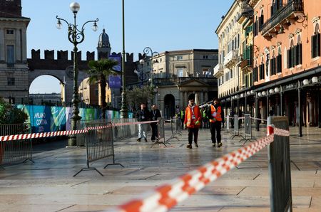 The ceremony is being held in an open-air Roman amphitheatre renowned for staging opera and pop concerts in the heart of the northern Italian city made famous as the setting for William Shakespeare’s play “Romeo and Juliet”.