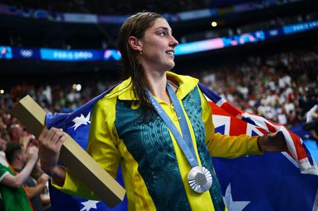 PARIS (Reuters) – Australia’s ambitions of dethroning the United States as the greatest swimming team were quashed on the final day of the Paris Olympic meet on Sunday, but their top women swimmers celebrated anyway by leaping into the pool in their tracksuits.