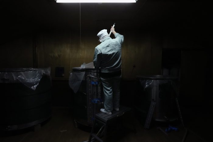 As the brewery enters the winter peak season, Takahashi oversees a team of seasonal workers and production ramps up. It’s labor-intensive work, hauling and turning large amounts of heavy steamed rice, and mixing thousands of liters (hundreds of gallons) of brew. The master brewer must have the knowledge and skill to carefully control optimal koji mold growth, which needs round-the-clock monitoring.