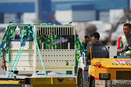 HONG KONG (Reuters) – Pandas An An and Ke Ke, a gift from Beijing to Hong Kong, arrived in the Chinese territory on Thursday to much fanfare, with officials welcoming them at the city’s international airport with a red carpet on the tarmac and panda toys.