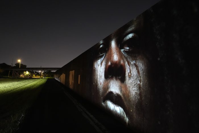 In one frame, the wreckage and rubble outside a house in 2005 is projected, at night, against the house as it stands today. In another, a woman, huddled up, wrapped in an American flag, braces herself against the elements and the world around him. Today, projected against a building, it is a phantom portal into another era.