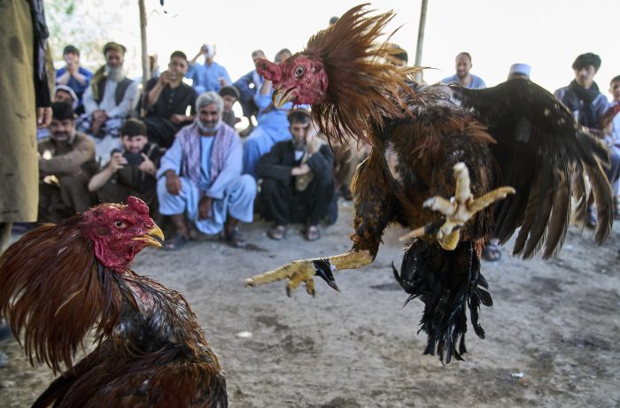 KABUL, Afghanistan (AP) — When a cockfight begins in Kabul, the noise is immediate. Roars of “Hit!” and “Kill!” erupt among spectators as two birds lunge at each other, feathers and blood flying.