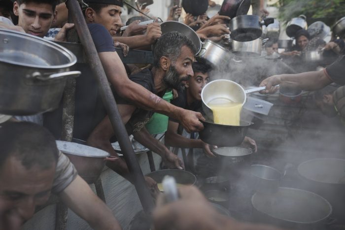 GAZA CITY, Gaza Strip (AP) — Palestinians desperately reached out for food at a crowded community kitchen on Monday in Gaza City, in northern Gaza Strip. Israel’s war against the militant Hamas group in Gaza has driven the majority of the civilian population in the territory from their homes while aid groups say they have struggled to bring in assistance and experts warn of famine.
