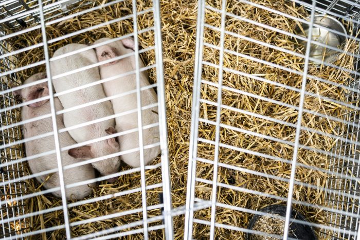 The central exhibit at Copenhagen’s “And Now You Care” exhibition is a makeshift cage created with shopping carts containing three piglets. As the exhibition opened Friday evening, they were still fine, but they will not be given food and drink, and can be expected to die of hunger within a few days.