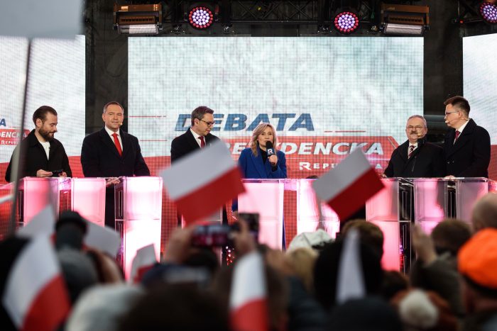 In the end, there were in fact two debates — the first one took place outdoors and was broadcast by two right-wing stations with rowdy onlookers whistling and booing candidates they didn’t like. A left-wing candidate, Joanna Senyszyn, arrived late, joining the others about 20 minutes after the event began.