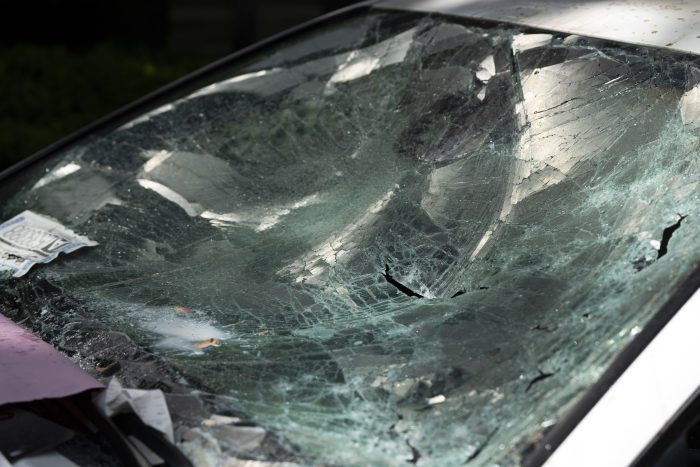 Demonstrators badly damaged the car, smashing in windows and spray painting graffiti on it.