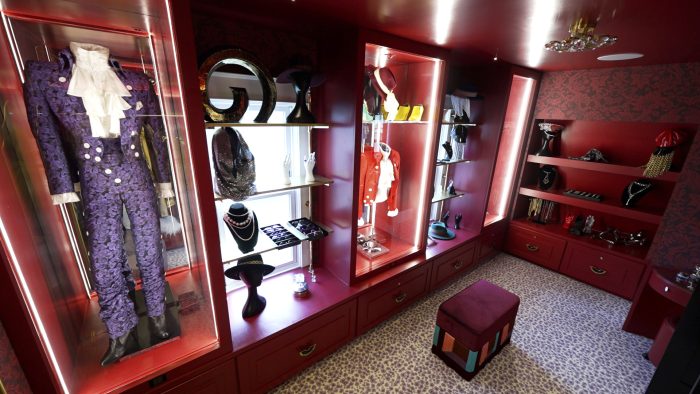 Although the white, two-story home with brown trim in Minneapolis looks unassuming from the outside, there’s plenty inside to make the late icon’s devotees delirious over this new, limited-time Airbnb rental. Upstairs, a big closet with paisley wallpaper and leopard-spotted floor displays iconic outfits worn by Prince behind glass and has other outfits available to make renters the beautiful ones.