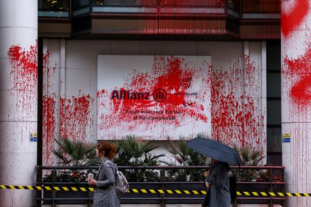 LONDON (Reuters) -Pro-Palestinian activists targeted the British offices of German financial services firm Allianz on Tuesday, daubing the outside with red paint in protest over the company’s links to Israeli defence firm Elbit Systems.