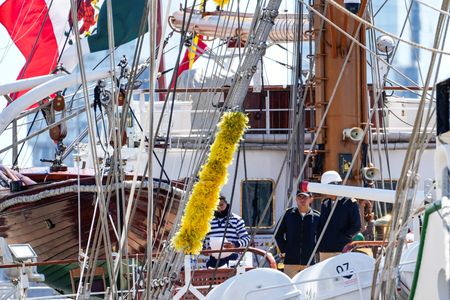 The strike knocked dozens of white-uniformed naval cadets off the ship’s crossbeams, where they were standing ceremoniously for her exit from the harbor. They could be seen dangling from their harnesses high above the ship’s deck.