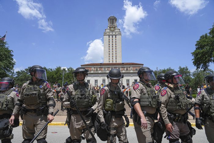 On April 29 at UT, officers in riot gear encircled about 100 sitting protesters, dragging or carrying them out one by one amid screams. Another group of demonstrators trapped police and a van full of arrestees between buildings, creating a mass of bodies pushing and shoving. Officers used pepper spray and flash-bang devices to clear the crowd.