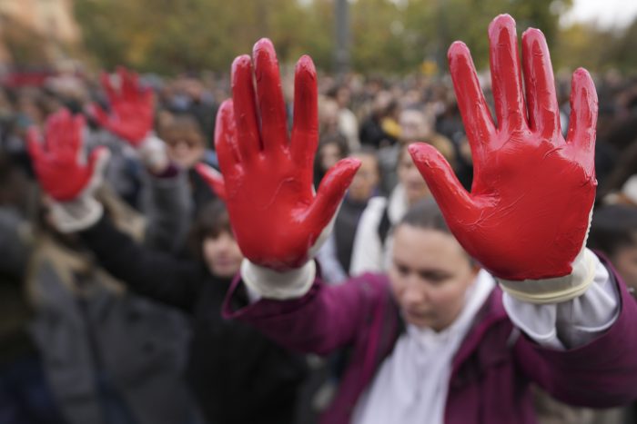 BELGRADE, Serbia (AP) — Angry protesters on Sunday left red handprints at the entrances of government buildings in the Serbian capital to demand the arrest of officials, two days after a concrete canopy collapsed at a railway station, killing 14 people and injuring three. Police formed a cordon outside the seat of the Ministry of […]