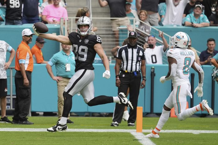 Bowers had 13 catches for 126 yards and a touchdown for Las Vegas in a 34-19 loss at Miami. The rookie shook his arms and swayed his hips like Trump after a 23-yard catch-and-run TD.