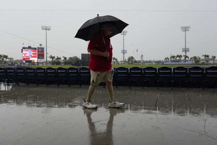 Because of the forecast for rain Monday that proved accurate, two schedule changes were announced Sunday. The first pitch for the Yankees-Red Sox game and Atlanta’s game against Baltimore in Sarasota had both been pushed back three hours to 4:05 p.m. EST.