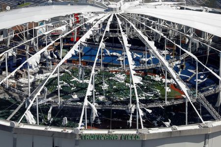 Tropicana Field’s roof was torn apart when Hurricane Milton made landfall south of Tampa on Oct. 9. It has been estimated that the stadium, in St. Petersburg, will need about $56 million in renovations.
