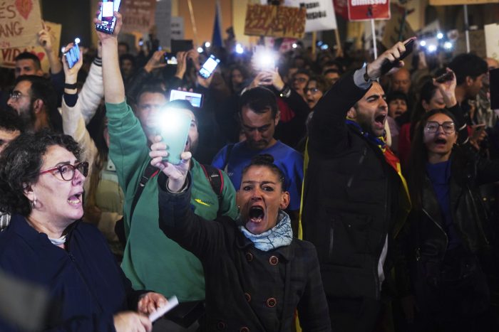 Mazón’s administration didn’t issue flood alerts to people’s cellphones until flooding had already started in some areas. Saturday’s march culminated with people playing the shrill alert they received on their phones in unison.