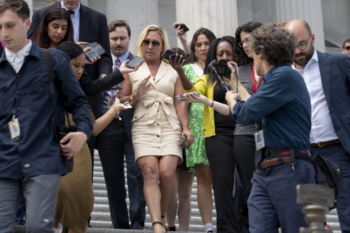 Speaking outside the Capitol, Greene ranted against Republican Party leaders at the highest levels and pushed back against their public entreaties, including from Donald Trump, to avoid another messy political fight so close to the November election. With her was Rep. Thomas Massie, R-Ky., one of the few lawmakers to join her effort.