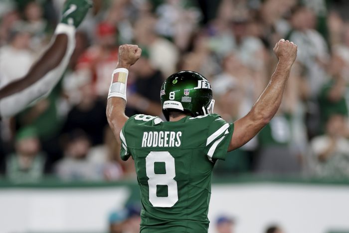 The star quarterback threw two touchdown passes while being showered with “Aa-ron! Rod-gers!” chants throughout, New York’s defense was dominant and the Jets rolled to a 24-3 victory over the New England Patriots in their home opener Thursday night.