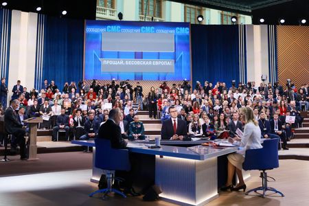 Selected questions were put to Putin by moderators or people in a live audience who vied to attract his attention by waving banners.
