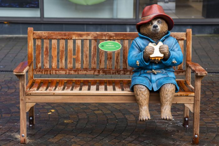 The statue of the bear in his signature blue coat and red hat was one of 23 installed last fall as part of a Paddington trail across England to mark the release of “Paddington in Peru.” The introspective bear is gazing skyward while clutching a sandwich — with marmalade about to drip on his lap.