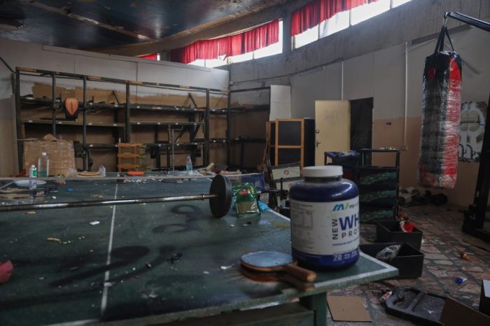 Inside what had been living quarters for the soldiers was largely empty, with scattered items left behind, including workout equipment, protein powder and some clothing.